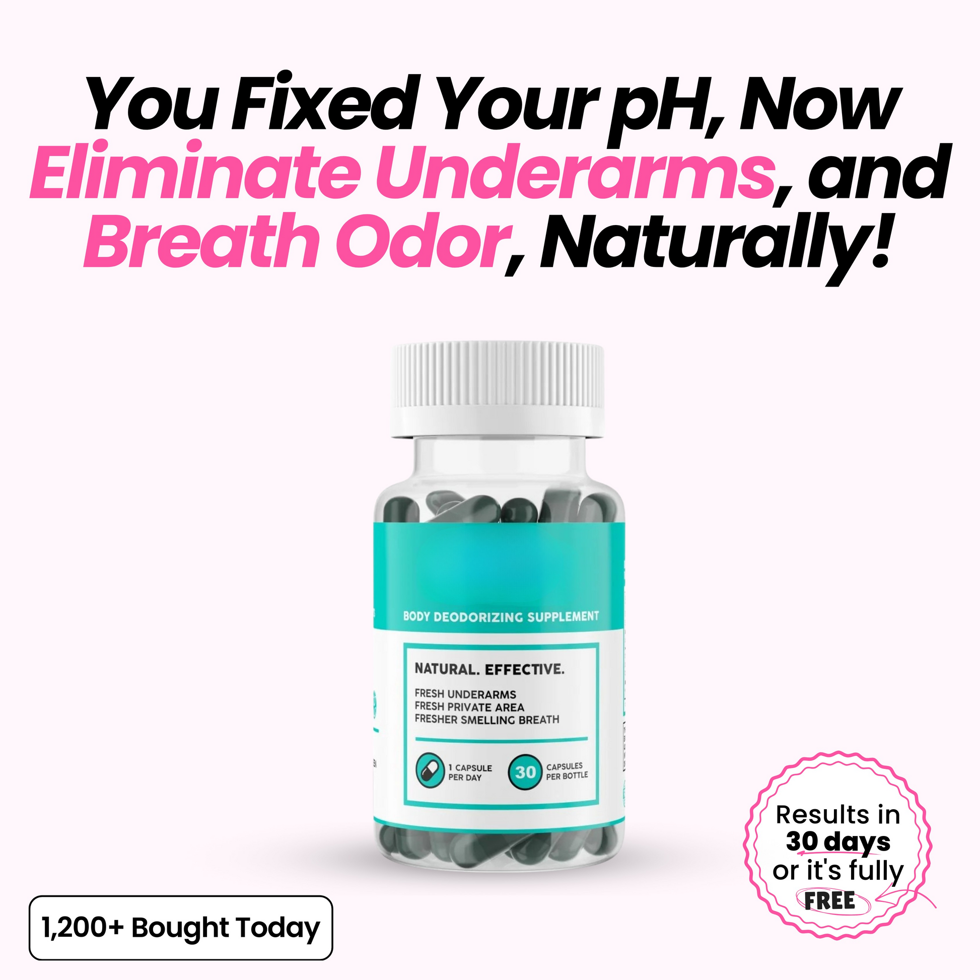 This deodorant helps eliminate odor from head to toe—breath, body, underarms, and down there—by working from the inside out. Naturally balances pH and fights odor at the source, so you stay fresh all day.